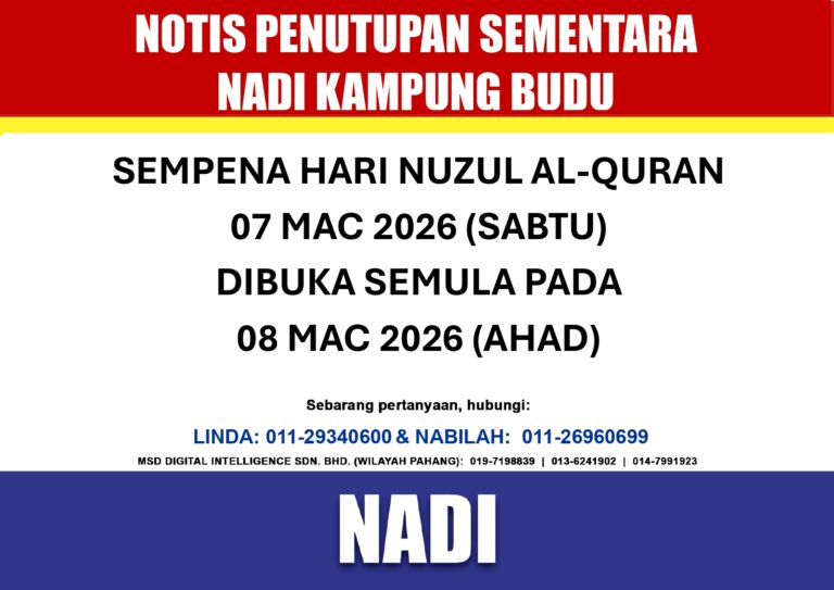 MAKLUMAN PENUTUPAN SEMENTARA OPERASI Pusat Sebaran Maklumat Nasional (NADI) Kg. Budu akan ditutup sementara pada 7 Mac 2026 (Sabtu) bersempena dengan Hari Nuzul Al-Quran. NADI Kg. Budu akan beroperasi semula seperti biasa pada 8 Mac 2026 (Ahad). Kami juga ingin […]