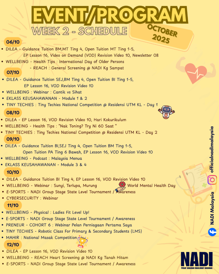 Program Perkhidmatan Pintar NADI Minggu Ke-2 Oktober Akan Beraksi! Bermula 6 โ 12 Oktober 2025, macam-macam aktiviti BEST menanti โ daripada tuisyen percuma, webinar kesihatan, e-sukan, kelas robotik, sampai ke National Masak Competition! Semua orang ada pilihan โ belajar , […]