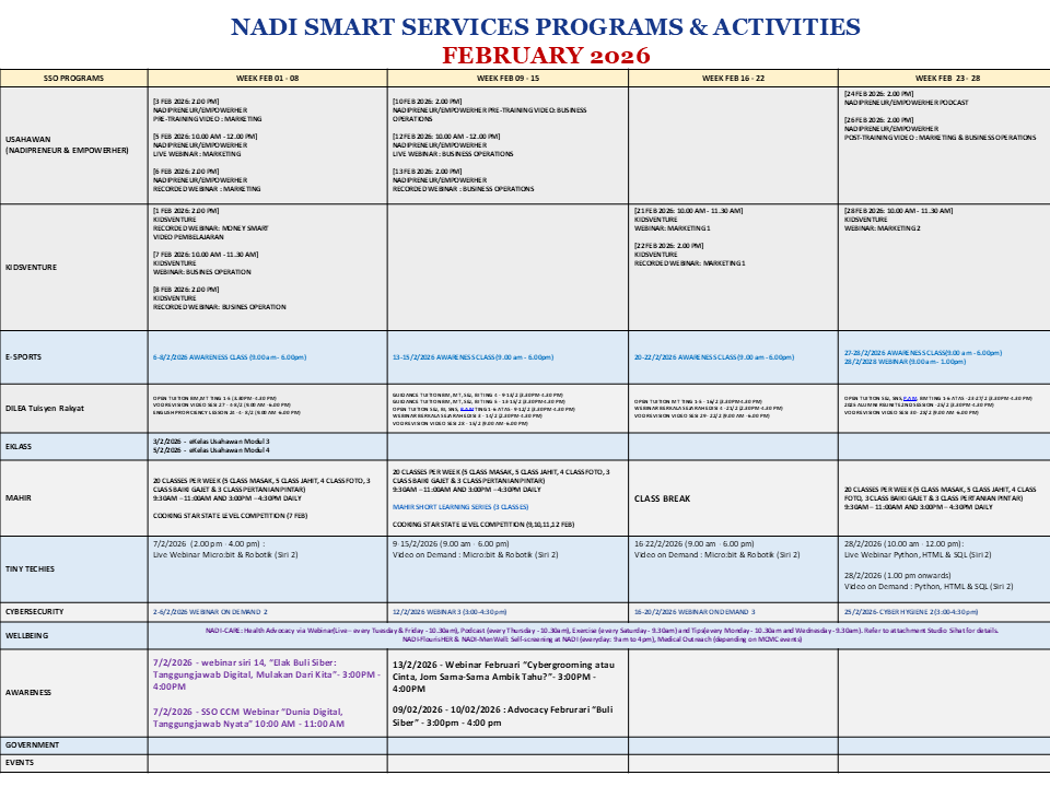 JADUAL PROGRAM PERKHIDMATAN PINTAR NADI FEBRUARI 2026